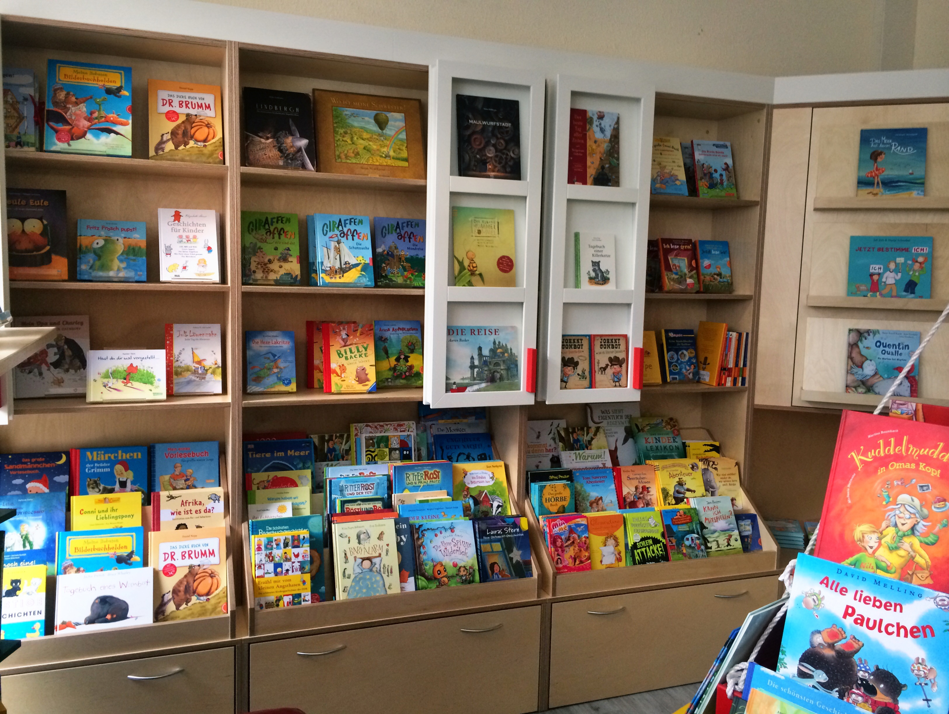 Endlich ! Aus einer Wunschvorstellung und zwei Besuchen bei Kolleginnen der Branche entstand eine Skizze und daraus ein Projekt. Realisiert von der Rostocker Tischlerei Freitag. Jetzt ist es Realität und schöner geworden als gedacht. Die weissen Schiebetüren funktionieren perfekt und in jeder ist Platz für drei besonders gute Bücher. So kannst Du leichter sehen welches Buch ausgefallen gut ist und wir Dir deshalb besonders empfehlen. Jetzt fehlt nur noch die neue Bücherinsel und die Beschriftung auf den Regalen – dann ist wieder ein Stück vom Laden neu eingerichtet damit Du es bei einem Besuch schöner hast.