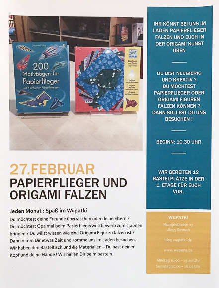 Du möchtest deine Freunde überraschen oder deine Eltern ? Du möchtest Opa mal beim Papierfliegerwettbewerb zum staunen bringen ? Du willst wissen wie eine Origami Figur zu falzen ist ? Dann nimm Dir etwas Zeit und komme uns im Laden besuchen. Wir haben den Basteltisch und die Materialien – Du hast deinen Kopf und deine Hände ! Wir helfen Dir beim basteln.